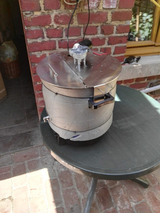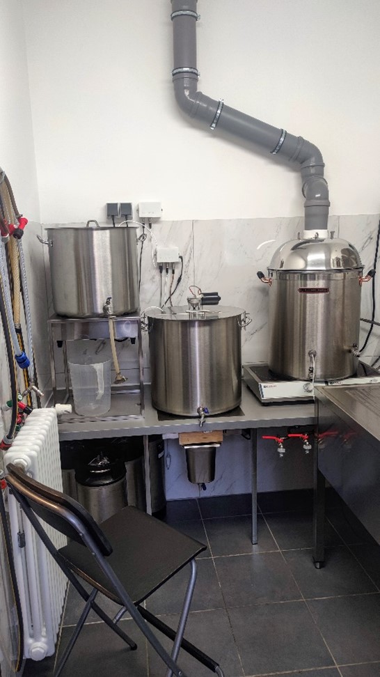 Im Winter 2018/2019 wurde es jedoch zu kalt und ungemütlich um draußen Bier zu brauen. Die Anlage erreichte auch nicht mehr die gewünschten Temperaturen. Die Idee: Dann brauen wir doch einfach in der Werkstatt. Dabei ist es nicht geblieben. Es wurde immer mehr und bessere Ausstattung angeschafft. Die Kapazität der Anlage wuchs von 20 auf 70 Liter. Der Strombedarf übrigens auch: von 2 kW auf über 12 kW.